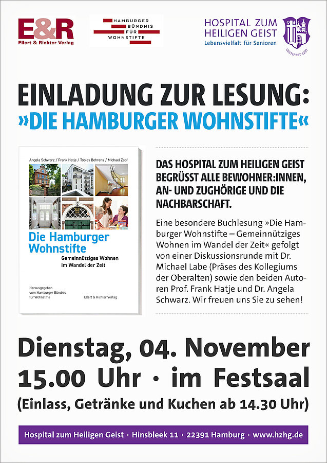 Info: Eine besondere Buchlesung »Die Hamburger Wohnstifte – Gemeinnütziges Wohnen im Wandel der Zeit« gefolgt von einer Diskussionsrunde mit Dr. Michael Labe (Präses des Kollegiums der Oberalten) sowie den beiden Autoren Prof. Frank Hatje und Dr. Angela Schwarz. Wir freuen uns Sie zu sehen.